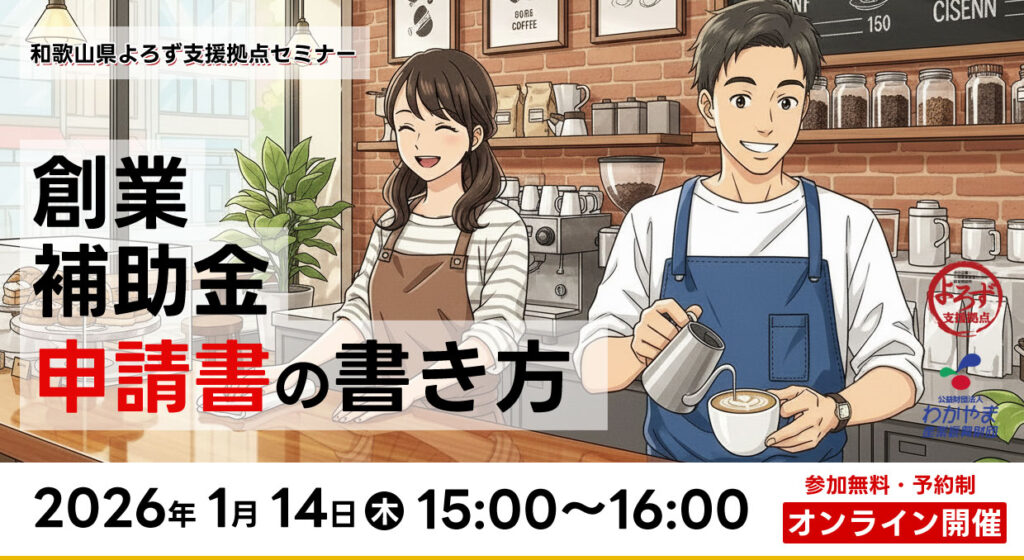 | セミナー・勉強会タイトル | 創業/助成金 オンラインセミナー「創業補助金/申請書の書き方」2026年1月14日(水)15:00 |