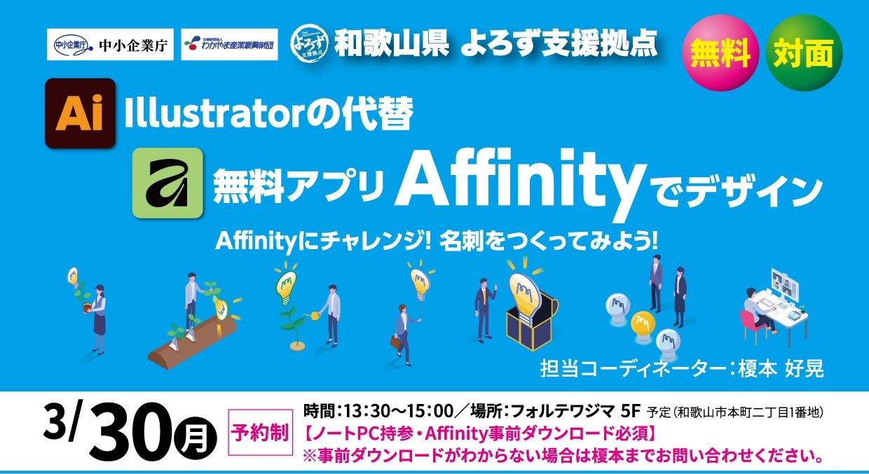 | セミナー・勉強会タイトル | デザイン オンラインセミナー「Illustratorの代替 無料アプリAffinity」2026年3月30日(月)13:30~ |